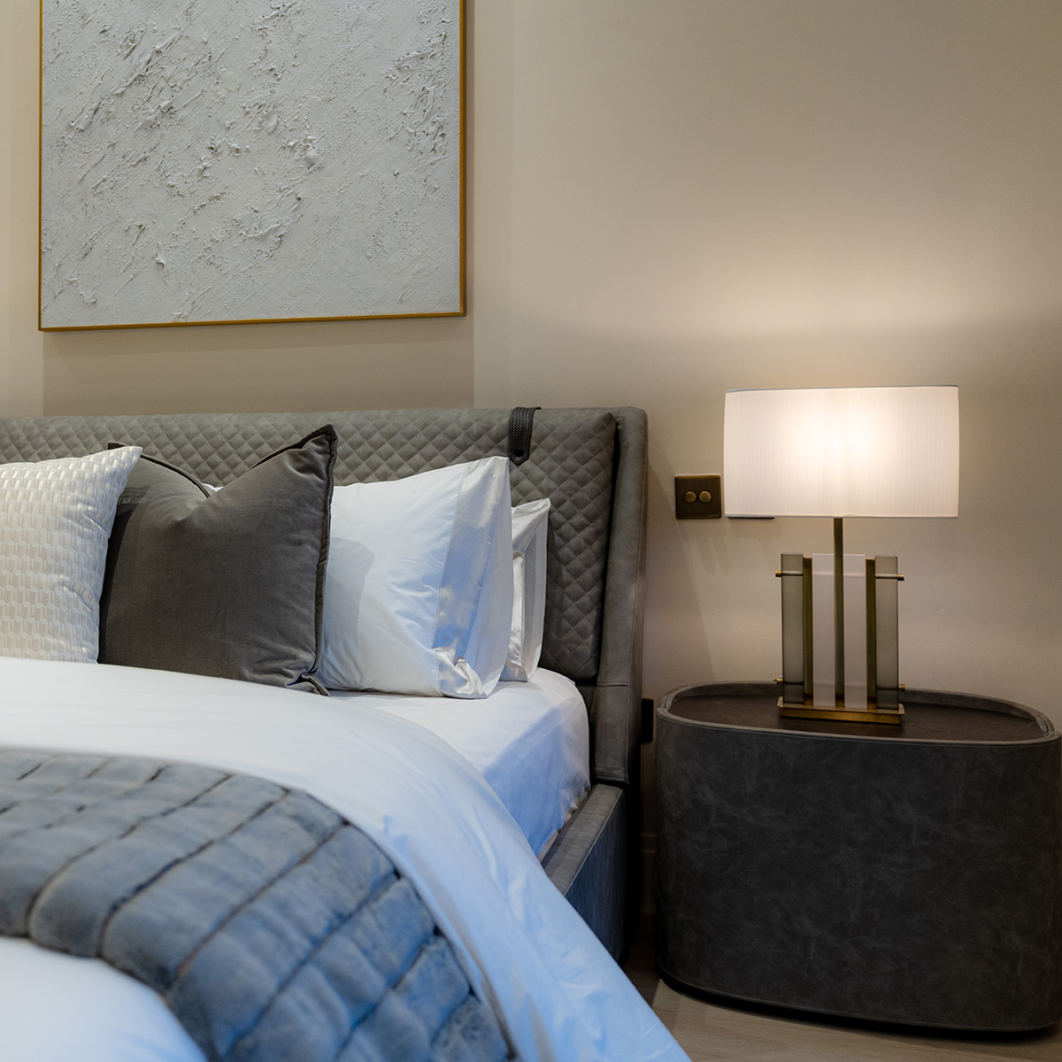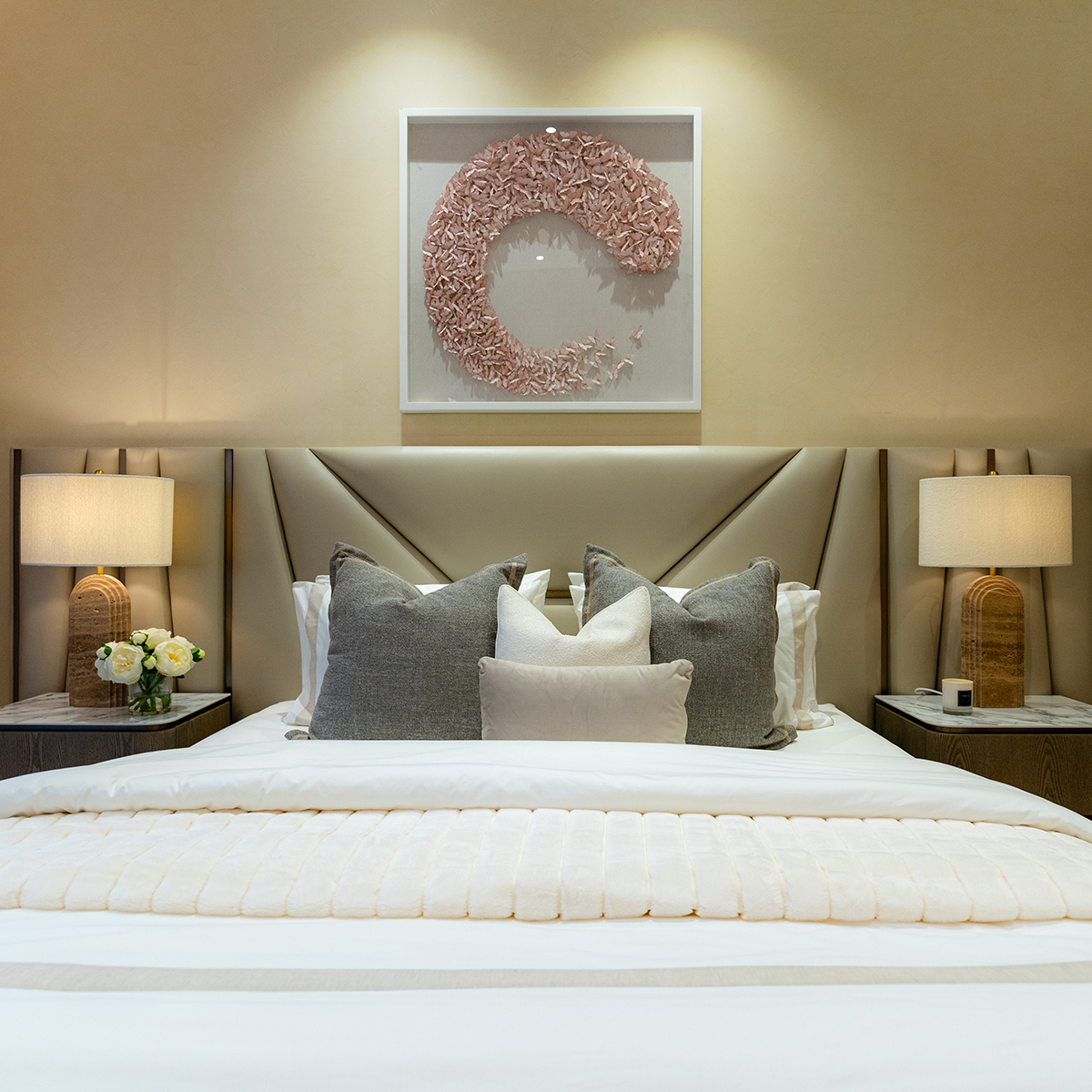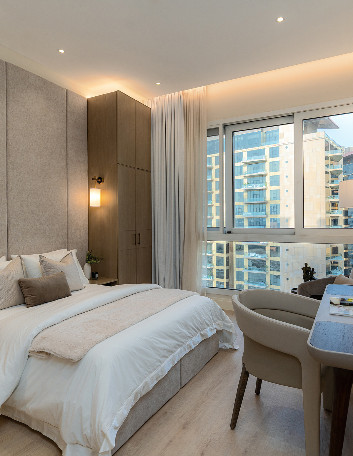 This three-bedroom apartment offers a large master suite with a generous bedroom, separate dressing area with luxury bespoke wardrobes, and an ensuite with a double vanity unit and separate bath & shower.