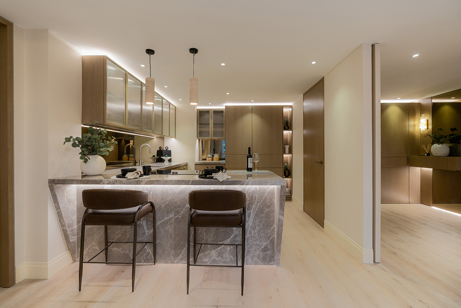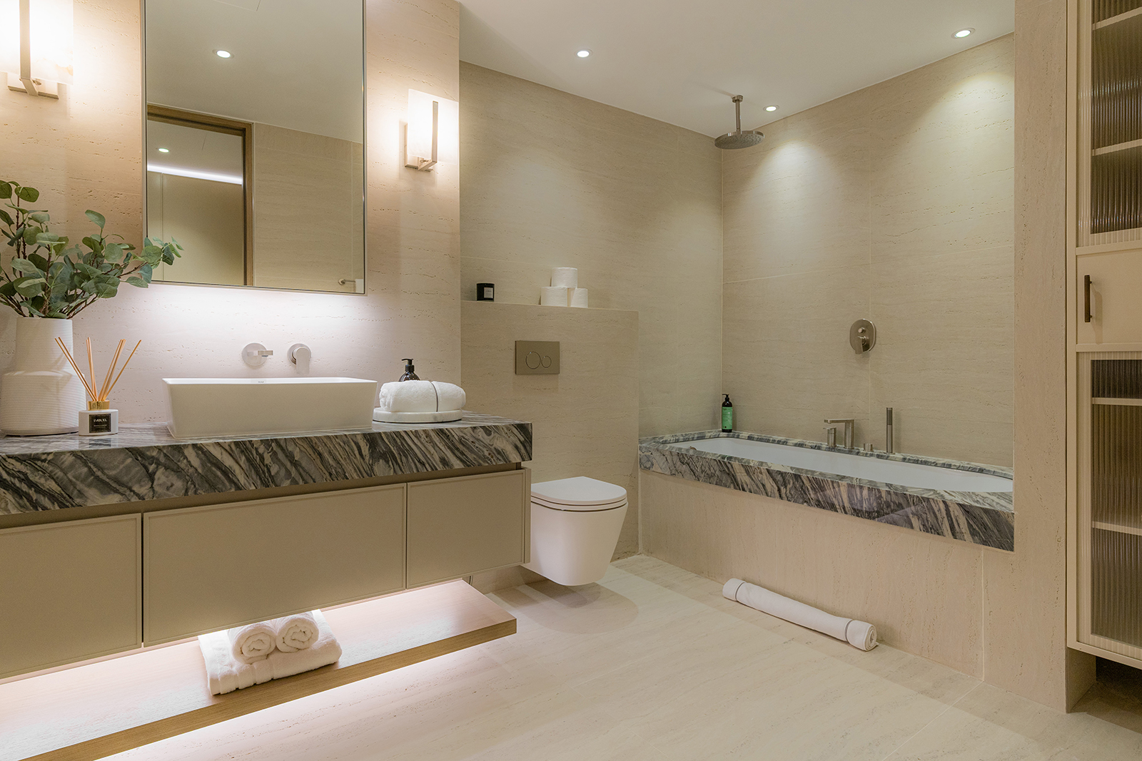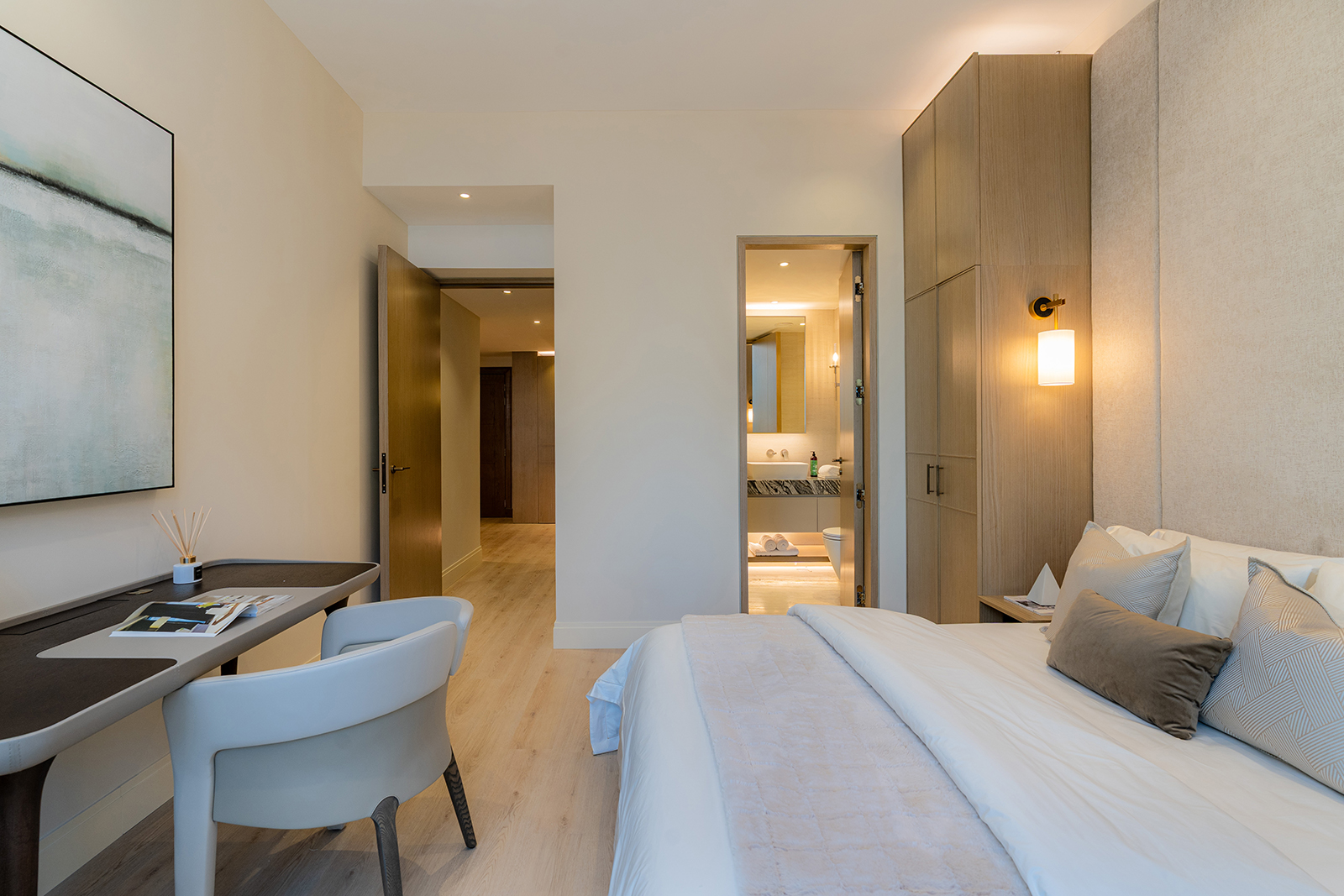 This three-bedroom apartment offers a large master suite with a generous bedroom, separate dressing area with luxury bespoke wardrobes, and an ensuite with a double vanity unit and separate bath & shower.