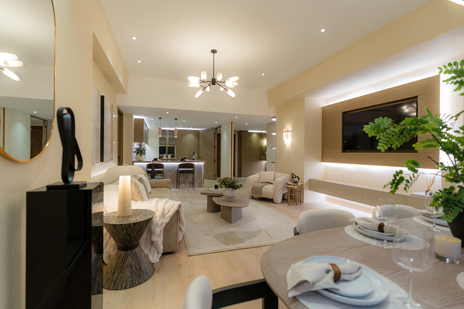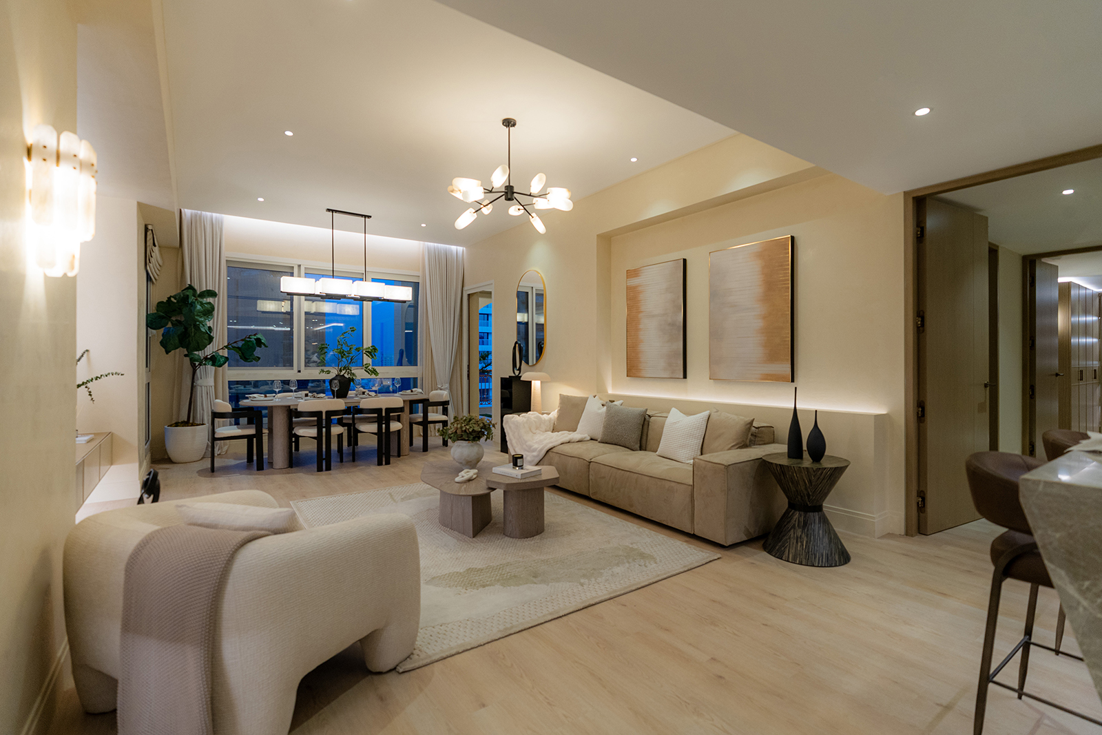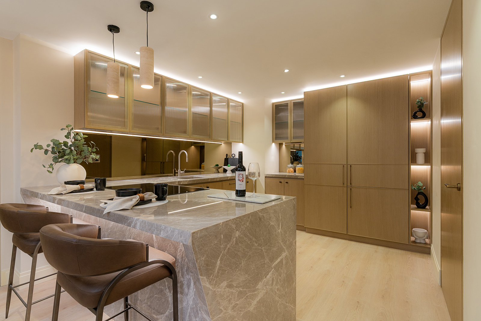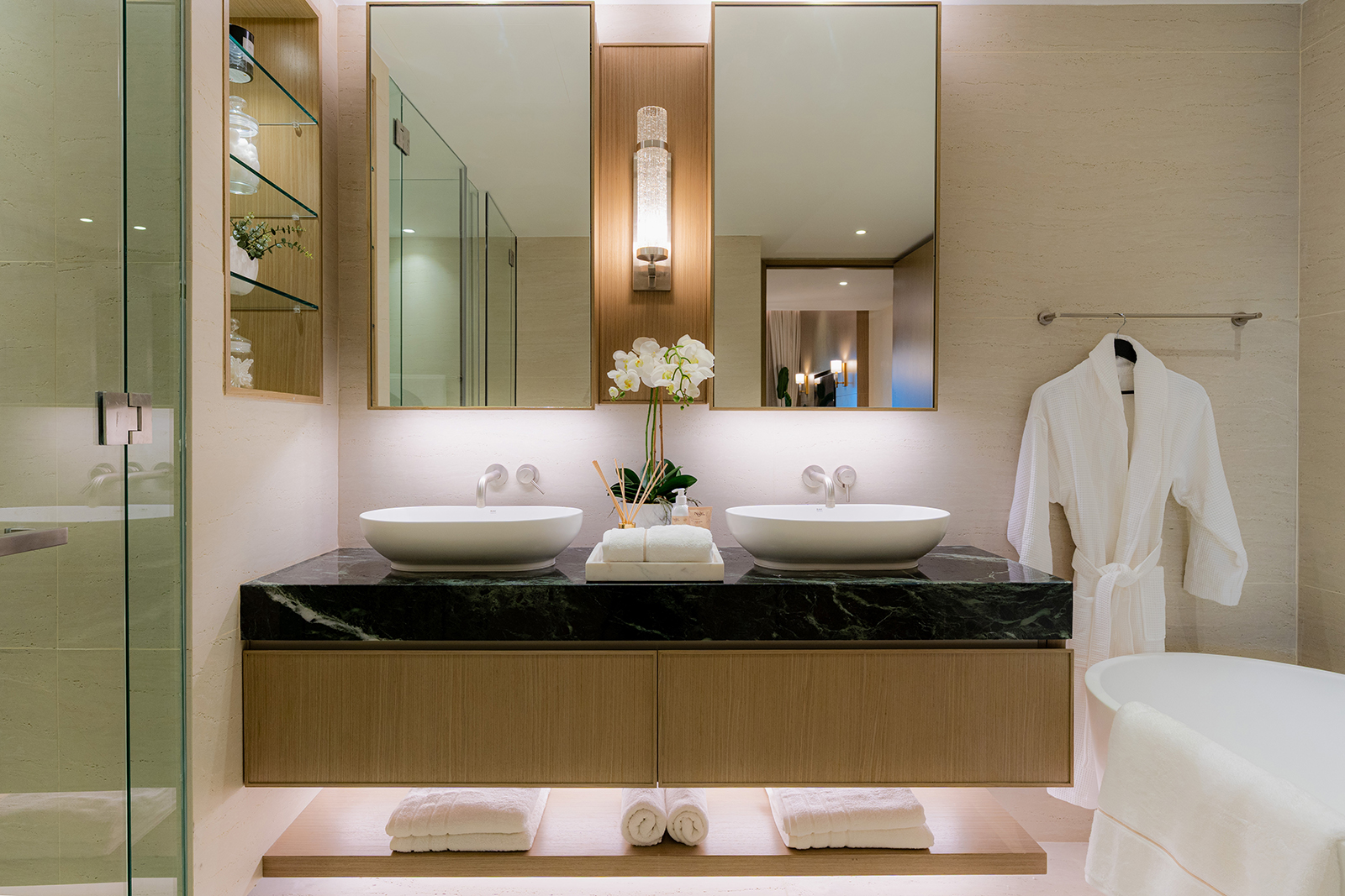 This three-bedroom apartment offers a large master suite with a generous bedroom, separate dressing area with luxury bespoke wardrobes, and an ensuite with a double vanity unit and separate bath & shower.